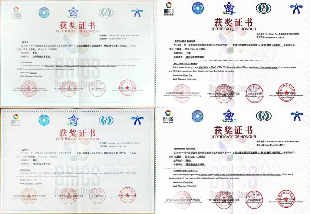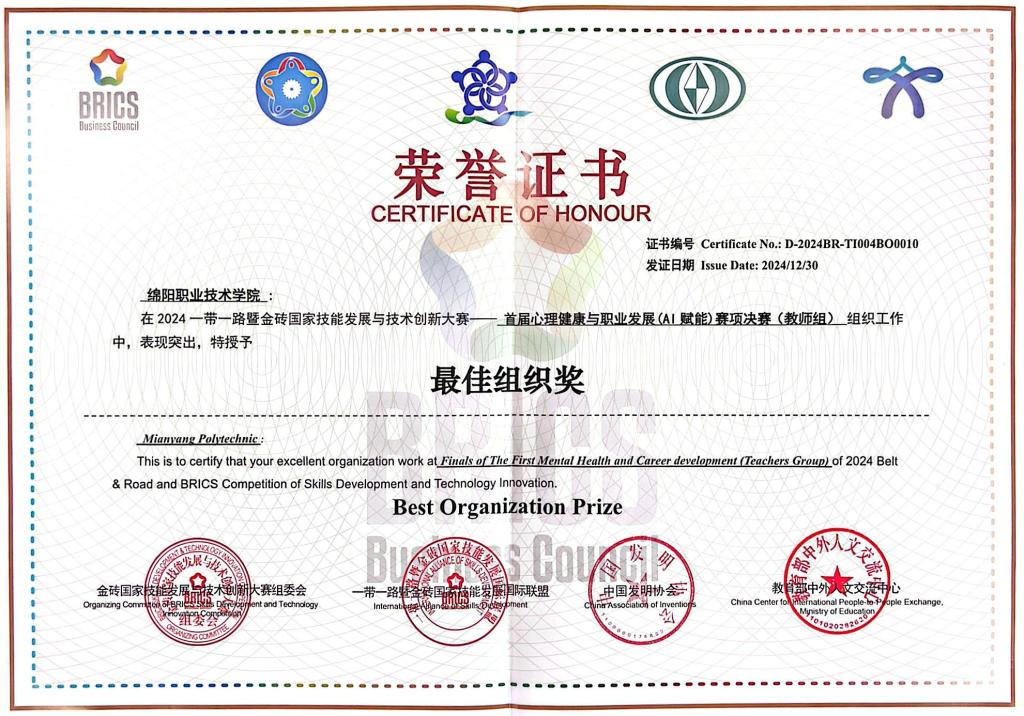 12月26至30日,2024“一带一路”暨金砖国家技能发展与技术创新大赛首届心理健康与职业发展(AI赋能)赛项决赛在四川乐山举办,来自全国33所职业院校百余名师生同台竞技。经过激烈角逐,我校智能制造在线播放教师孙薇、学生工作部心理中心教师龚勋分别荣获教师组一等奖和优秀奖,智能制造在线播放数控231班陈俊文荣获国内学生组三等奖、材料与建造在线播放材料本科2301全佳一荣获优秀奖;旅游管理在线播放黄梓茼荣获国际学生组三等奖,王沐辰荣获优秀奖。91天堂国产在线荣获最佳组织奖。