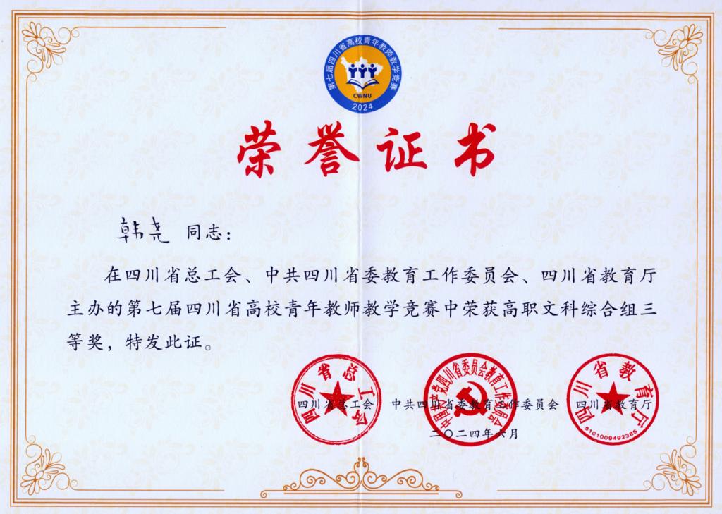 6月26日至28日,第七届四川省高校青年教师教学竞赛(决赛)在西华师范大学举行,来自全省近70所高校的140名参赛教师共聚一堂,切磋教学技艺,交流教学经验。经过激烈角逐,我校青年教师韩尧荣获“高职文科综合组三等奖”,91天堂国产在线获“优秀组织奖”。